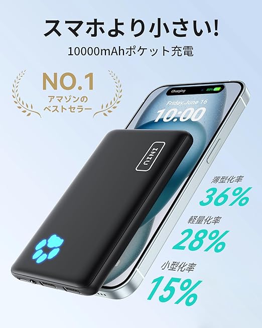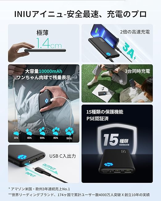 【INIU-安全急速、充電のプロ】INIUモバイルバッテリーは、世界中で4000万人以上に選ばれた充電のプロ仕様。大容量でも安心の急速充電、軽量・コンパクト設計で持ち運びやすく、ビジネスから旅行まで24時間の充電フルサポートを実現します。PSE認証を取得し、15層の安全保護機能を備えたバッテリーで、高密度バッテリーの安全性を徹底追求。全製品に3年間の保証付きで、安心してお使いいただけます。