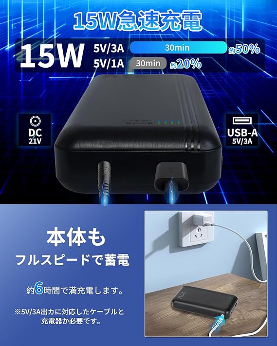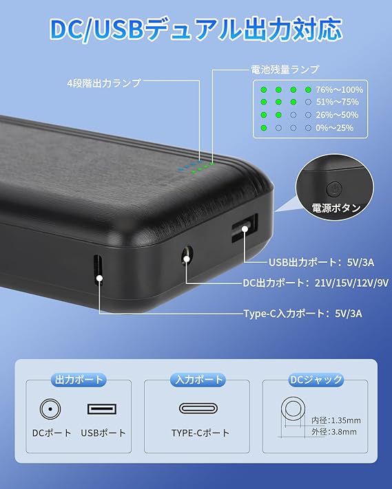 空調作業服 バッテリー 21V高出力 20000mAh大容量 モバイルバッテリー DC/USB 2WAY出力 Type-C入力 急速充電 空調ウェア バッテリー 4段階風量調節 熱中症?策 旅行/出張/停電/緊急用 防災グッズ a