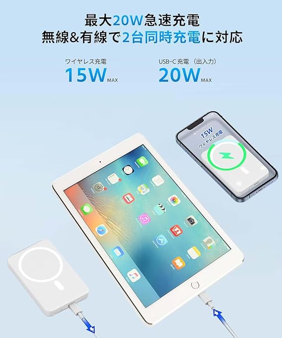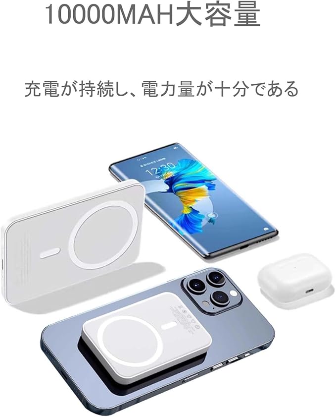 【10000mAhマグネット充電器】このモバイルバッテリーは、10000mAhの大容量を誇り、従来の5000mAhや8000mAhモデルと比較して、同じサイズでより多くの充電を提供します。iPhoneであれば2から3回分の充電が可能で、コンパクトボディでご家庭やオフィスでのご使用にも場所を取らずにおすすめです。軽量(約200g)で、移動中に動画やアプリのゲームを楽しむ方に最適な選択です。日常使いだけでなく、キャンプや停電時の非常用電源としても大活躍します