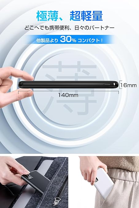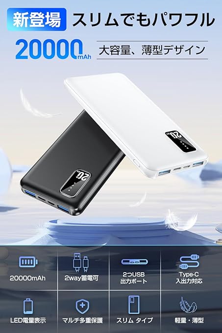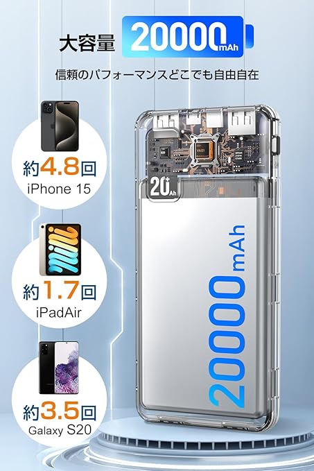 【20000mAh超大容量・長時間外出でも安心】この モバイルバッテリー は、圧倒的な モバイルバッテリー 20000mah の大容量設計により、スマートフォンを約5〜6回フル充電できる高性能モデル。 モバイルバッテリー 大容量 軽量 として設計されており、重すぎず持ち運びやすい点も魅力です。 モバイルバッテリー iphone や モバイルバッテリー アンドロイド 、さらにはタブレット、イヤホン、スマートウォッチなど幅広い機器に対応し、 モバイルバッテリー タイプc ポート搭載で急速充電もスムー