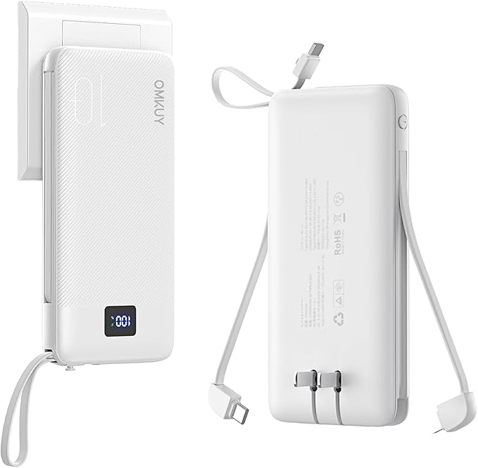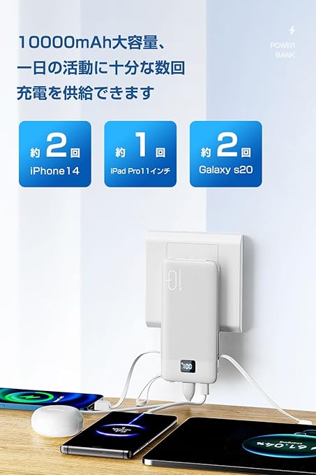 【OMKUY 新登場】モバイルバッテリー 大容量 コンセント 10000mAh 薄型(折り畳みコンセント一体式/パススルー/PD 20W&SCP22.5W急速充電/3本ケーブル内蔵)携帯充電器 持ち運び便利 コンパクト モバイルばってりー PD3.0 携帯バッテリー 軽量 スマホ AC パワーバンク PSE認証 iPhone&Android等対応 (White) a
