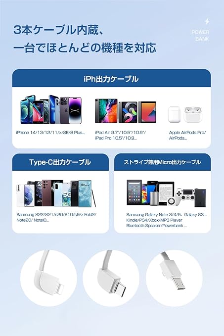 【OMKUY進化版一体型モバイルバッテリー】ACコンセットを搭載して、3本充電ケーブル、モバイルバッテリーと急速充電器の5役を1台にこなせるの一体式モバイルバッテリーです。パススルー充電が対応しますので、製品をコンセントに差し込めば、充電器として使えるし、コンセントから抜けば、10000mAhの大容量モバイルバッテリーに変化します。更に急速充電が追加して新たな充電体験を発生しました。収納しやすい折畳式ACプラグ搭載、世界各国の電圧(AC 100-240V)に対応しているので、海外旅行・出張に大活