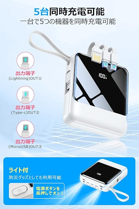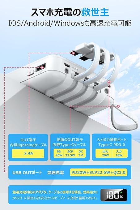 【2025業界新設計モバイルバッテリー!優れた実用性】外出するために設計された超軽量モバイルバッテリーが登場し、さまざまな煩わしい充電線を持ち込む必要がなく、モバイルバッテリーの内蔵ケーブルは出力と入力の需要を実現することができます。4本内蔵ケーブルで各種機器の充電も可能です。更に2個USB出力口付きで、最大5台の設備を同時に充電することもでき、友達家族と一緒にいるときは、必要に応じてみんなで充電することができます。携帯性を重視する方には、ケーブル内蔵型のモバイルバッテリーがおすすめです。外出す