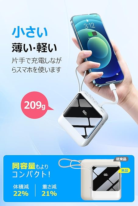 モバイルバッテリー 超軽量 小型 22000mAh大容量【業界新設計・22.5W/20W急速充電 209g超軽量】モバイルバッテリー 大容量 モバイルバッテリー 軽量 小型 4本ケーブル内蔵 急速充電 携帯充電器 USB-Type C入出力ポート 5台同時充電 LCD残量数字表示 スマホ充電器 コンパクト 持ち運び便利 機内持込可能 LEDライト付き PSE認証済 スマホ 全機種対応 (ホワイト) a
