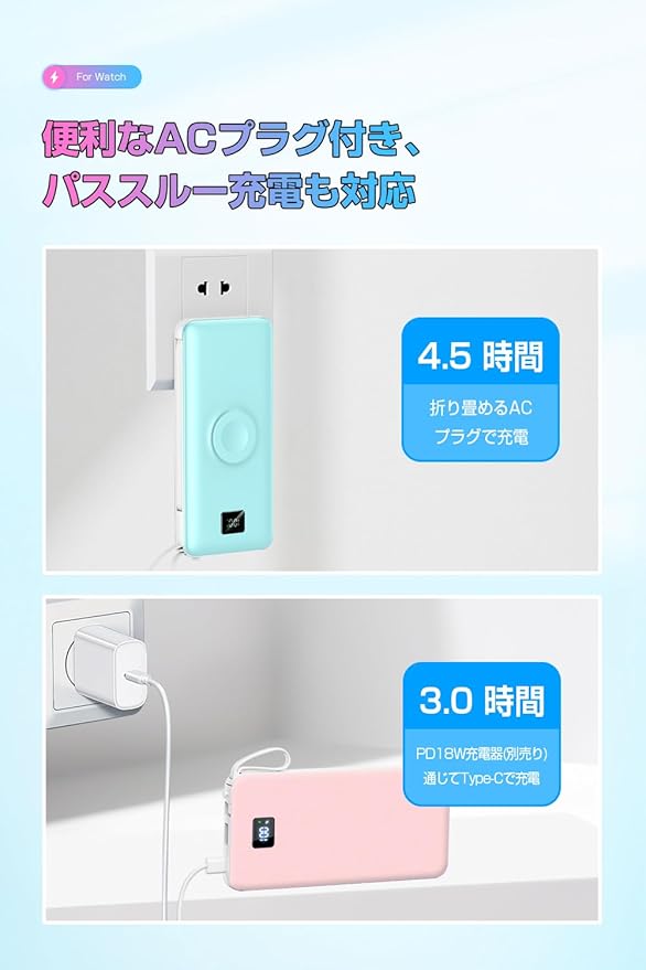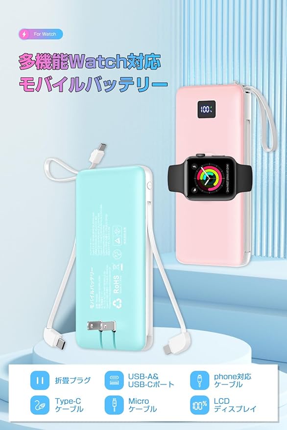 【OMKUY 新登場】iwatch モバイルバッテリー コンセント付き iwatch対応 充電器 10000mAh大容量(折り畳みACプラグ/パススルー/Watch&iPhone同時充電/PD 20W&SCP22.5急速充電/ケーブル内蔵)Type-C スマホ 携帯充電器 薄型 モバイルばってりー ウォッチ全Series&Android等対応(ピンク) a