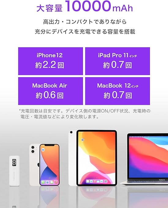 【PD30W 互換】 USB PD 30W (USB タイプ C) 出力をサポートします。 また、iPhone、Android、iPadなどのスマートフォン、タブレット、MacbookやMacbook Air M1などのラップトップの急速充電にも使用できます。30Wの充電は12Vのデバイスにのみ使用できます。 15Vまたは20Vがないと30Wを充電できないノートパソコンには対応していません。 充電中の製品に同梱されているケーブルと異なるケーブルを使用すると、電気が接続されていない場合があります。