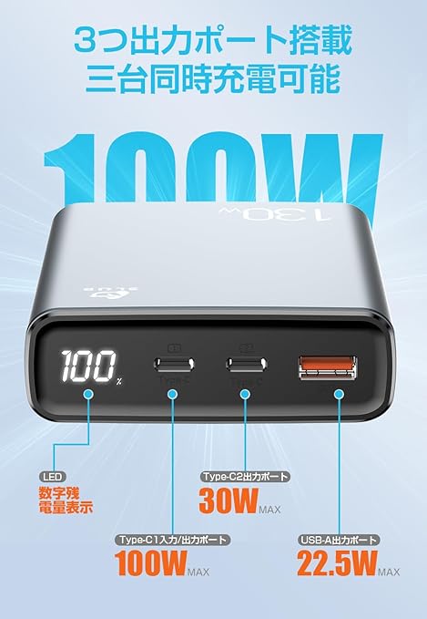 【100W急速充電 ノートパソコンにも対応】Type-C1ポートがPD100W出力対応で、ノートパソコンにも充電できます。旅行ヤ出張などに最適です。