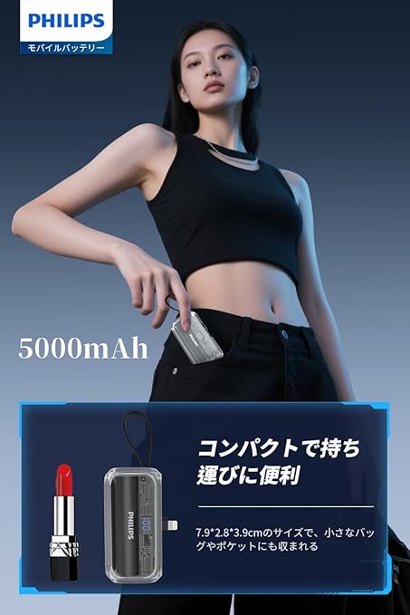 Philips (フィリップス) モバイルバッテリー 5000mAh 小型 Lightning コネクター USB-Cケーブル 内蔵 軽量 直差し コードレス 二台同時充電 モバイル充電器 パススルー機能 タイプc &ライトニング デバイス対応 PSE認証済 (ブラック) a