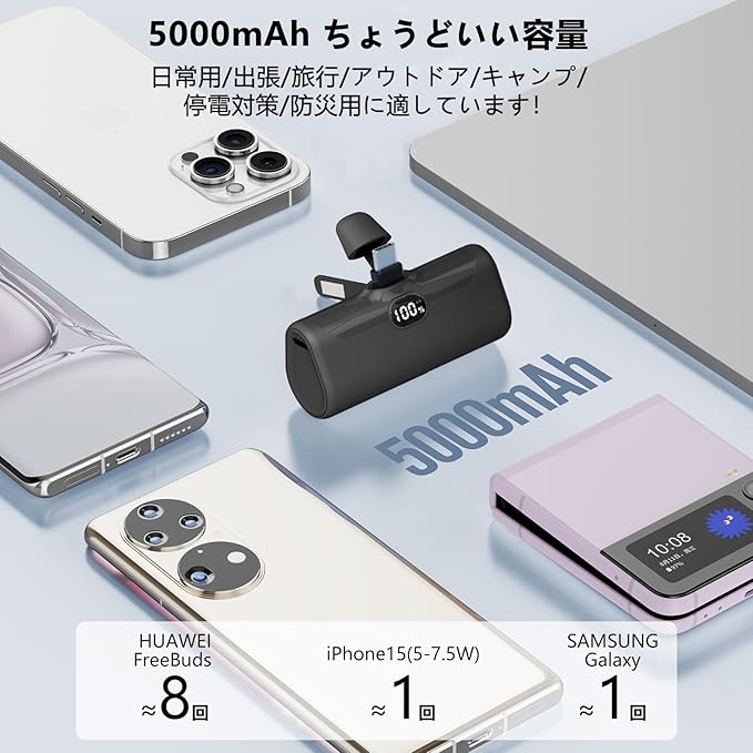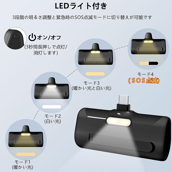 【直接充電&懐中電灯付き】このモバイルバッテリーはAndroidユーザー向けに設計で、差し込むだけで充電でき、USB-Cコネクタ内蔵型のモバイルバッテリーです。「ケーブルを忘れて充電できない…」ということも防ぐことができます。LEDライトは3段階の明るさ調整と緊急時のSOS点滅モードに切り替えが可能です。照明にも自撮りにも使える補光灯としても使えます。暗闇でライトとしても活用できます。遭難など、緊急時には点滅モードにも切り替えれば、声が出ない場合でも居場所を伝えることができます。
