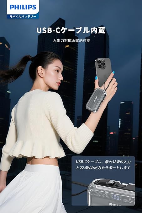 Philips (フィリップス) モバイルバッテリー 5000mAh 小型 USB-Cコネクター USB-Cケーブル内蔵 軽量 直差し コードレス 大容量 二台同時充電 モバイル充電器 パススルー機能 PSE認証済 タイプc デバイス対応 DLP2568C (ブラック) a