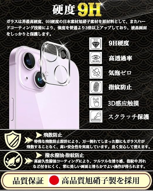 【最強硬度9H・飛散防止・日本製素材旭硝子製!】日本旭硝子製素材を採用し、業界最高水準の9H硬度を実現。ハードコート技術との組み合わせで衝撃を効果的に緩和し、カメラレンズの破損リスクを最小限に抑えます。同時に、キズや指紋からカメラレンズを保護する性