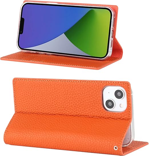 Eastwave アイフォン for iPhone 14 ケース 本革 牛革 for iPhone 14 ケース 手帳型 for iPhone14 カバー 手帳 本革 柔らかい 本皮 スプラットホール付き スプラット同梱 内蔵マグネット-オレンジ a