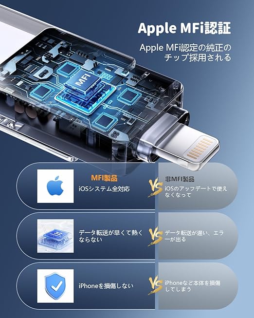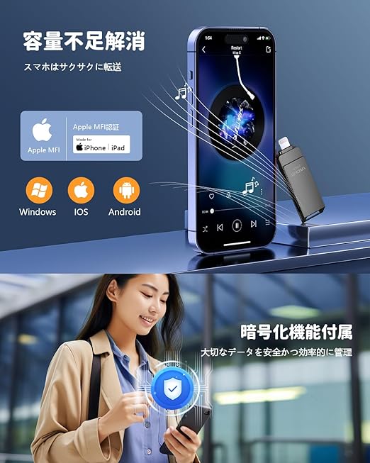 【Apple MFi認証取得・高い互換性】iPhone 用USBメモリでは、アップルが設けた認証プログラム Apple MFi が認定されております。これアイフォン バックアップはアップルより提供されたライトニングコネクタを使って、アップルのサポートを受けて作成された周辺機器です。なので、すべてのiPhoneおよびiPadシリーズと互換性があります。iPhone 14 /14 Pro/13 Pro Max/13 mini/ 12 /12 Pro/12 Pro Max/12 mini/ 11 /1