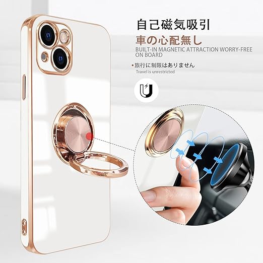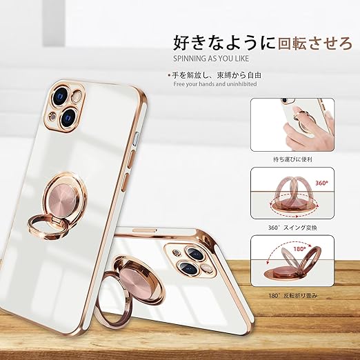 iPhone 13 ケース リング付き アイフォン13 リング カバー 全面保護 スマホケース TPU 耐衝撃 スタンド機能 車載スタンド対応 ストラップホール付き 擦り傷防止 メッキ加工 6.1インチ(ホワイト) a