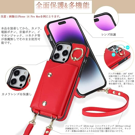 スマホカバー アイフォン13 miniケース 手帳型 PU革 カード収納 小銭入れ スマホケース iphone13 mini 手帳型ケース 長ストラップ リング付き iphone 13 mini 携帯カバー 肩がけ 首掛け 斜め掛け-レッド a