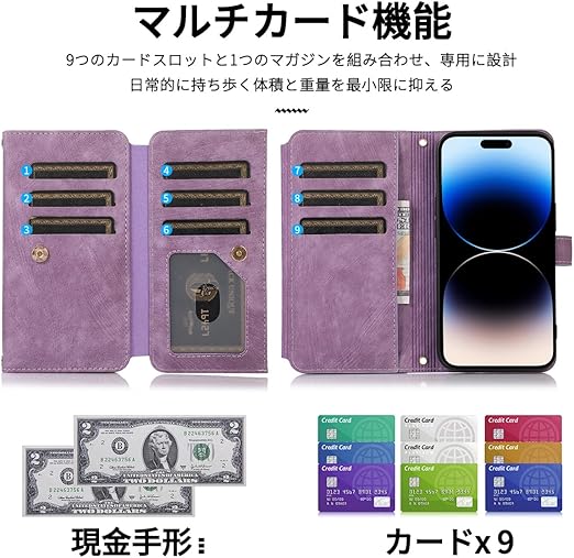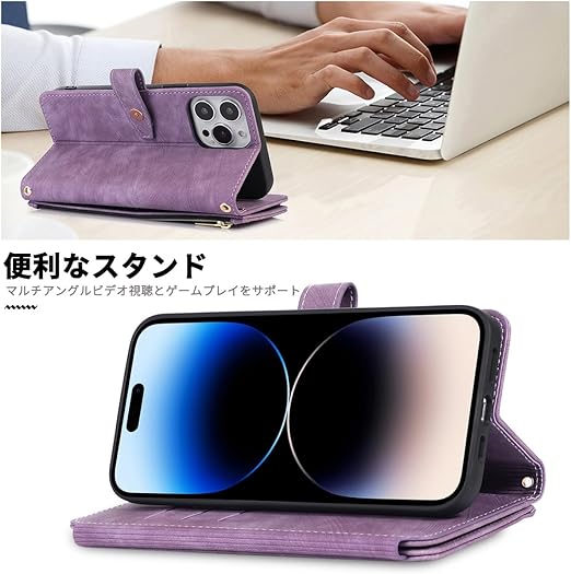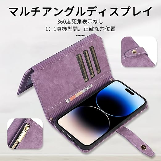 NKECXKJ iPhone 14 Pro 用 スマホケース アイフォン14Pro 肩掛け 首かけ 斜めがけ ショルダー PU革レザー iPhone14Pro 多機能 チャック付き 財布型 カバー いphone14pro 14pro アイフォン14プロ 手帳型 ケース カード収納 横置き スタンド機能 ?マグネットバックル付き 指紋防止 落下防止 薄耐衝撃 レディース メンズ(紫の) a