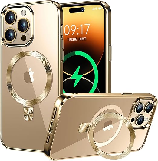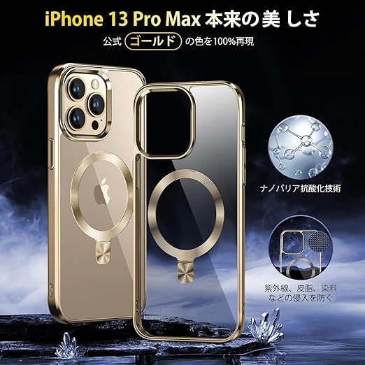 【CD MagSafeリング・スタンド一体】iPhone13 Pro Max 用クリアケース[MagSafe対応・隠しスタンド] [本体の色・メッキバンパー]ストラップホール付き 角度調整可 米軍MIL規格取得・耐衝撃 アイホン13 Pro Max透明ケース スマホケース13プロマックス人気6.7インチ(ゴールド) a
