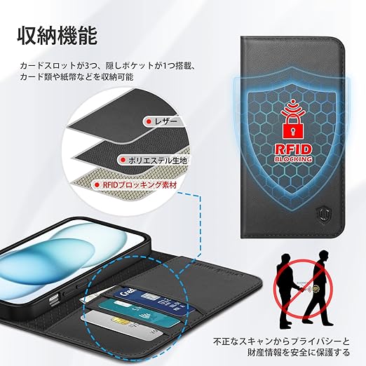【RFIDブロッキング技術採用・スタンド機能】本iPhone15 Plusケースはカードスロット&ポケットの裏地につける布は
