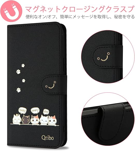 Qribo iPhone13 ケース 手帳型 アイフォン13 カバー シンプルなのに可愛いデザイン エンボス加工猫柄 うれしい気持ち 6.1インチ対応 iPhone 13 手帳カバー iPhone 13 カバー スマホケース iPhone 13 手帳型 ケース アイフォン13 ケース 薄型 防水 の耐久性 滑り防止 美しい 贈り物 友達 - 黒 a