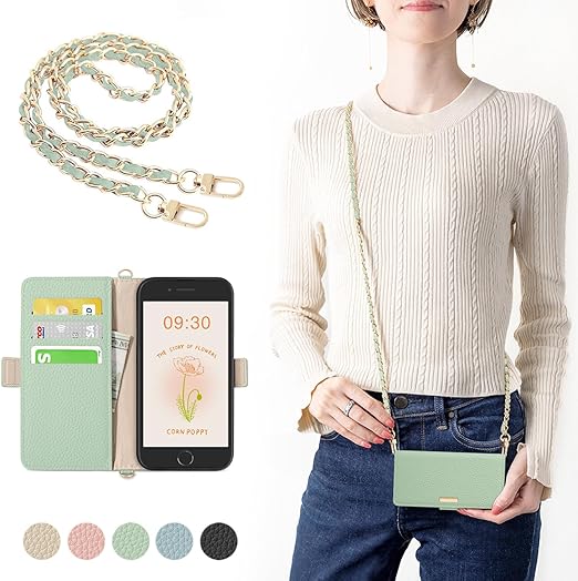 CASSYOOK iPhone SE ケース 手帳型 ショルダー iphone8 ケース 手帳型 肩掛け スマホケースiphone se おしゃれ 女性 iphone7 ケース 財布型 マグネット式 高級PUレザー iPhone se3/se2 ケース 手帳型 かわいい 収納 スタンド機能 アイフォン8 ケース 斜め掛け 耐衝撃 肌感レザー 肌触り良い(グリーン) a