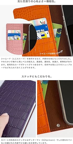【素材】本体(外側)・カードポケット・ストラップ : 牛革(本革にクロコダイル模様をエンボス加工) 本体(内側) : シャムード(人工スエード) 内側ケース : PC(ポリカーボネート)またはシリコン ステッチにはドイツの手芸糸老舗メーカー「ギッターマン(GUtermann)」の縫い糸を使用。※仕入れる生産ロットや裁断箇所により、色合いや模様の出方が若干変わる場合がございます。「イメージと違う」など初期不良以外での返品・交換はご遠慮いただいております。予めご了承くだ