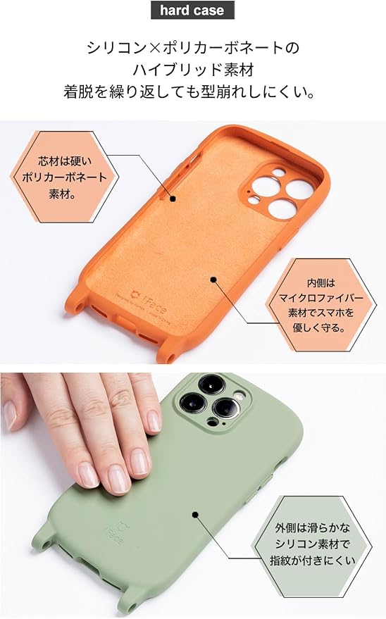 Keep on moving! 自分らしくスマホを持ち歩こう。「iFace Hang and (ハングアンド)」シリーズから、ショルダーストラップが付けられるシリコンハードケース単品が登場!「手持ちのストラップを使いたい!」「ストラップとケースの色を好きな組み合わせにアレンジしたい!」そんな要望にお応えしました。思いのままに組み合わせを楽しんでフリーになった両手でモバイルライフを楽しもう!ストラップホールを強化するため破損防止パーツを新たに付けました。※画像内にはパーツがないものが含まれます。i