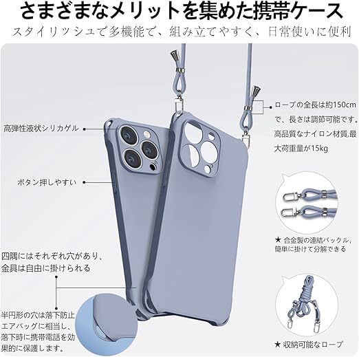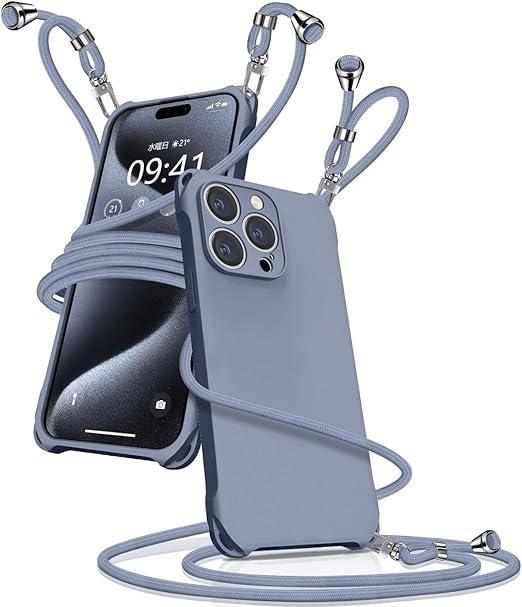 iPhone15 Pro Max ケース ショルダー シリコン iphone 15 Pro Max スマホケース アイフォン15Pro Max カバー 耐衝撃 肩掛け 斜めかけ 縄掛けケース 紐付き 斜めがけ 織りストラップ付き 長さ調整可能 取り外し可能 傷付き防止 マット質感 指紋防止(グレーブルー) a