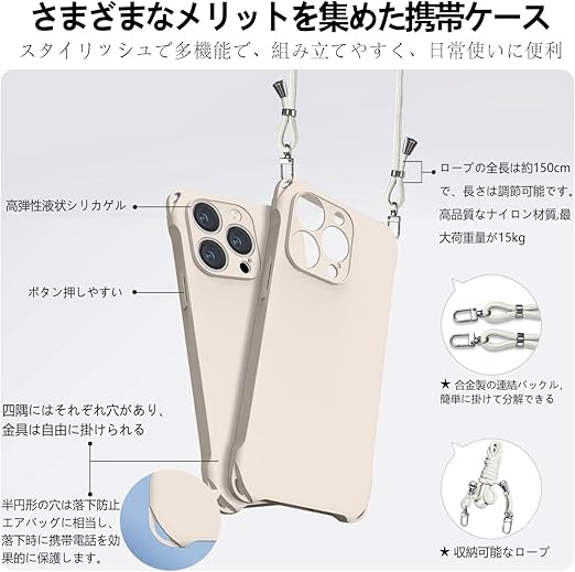 iPhone15 Pro Max ケース ショルダー シリコン iphone 15 Pro Max スマホケース アイフォン15Pro Max カバー 耐衝撃 肩掛け 斜めかけ 縄掛けケース 紐付き 斜めがけ 織りストラップ付き 長さ調整可能 取り外し可能 傷付き防止 マット質感 指紋防止(アンティークホワイト) a