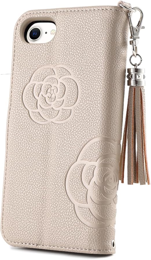 iPhone SE 第3世代/第2世代/iPhone8対応。高品質の合皮レザーにシンプルなお花柄(カメリア)を型押し、シンプルなデザインに大人っぽいお洒落さを味わいます。さらに本体に揃うタッセルチャームを装着しております。各シーンに合わせて簡単に取り外します。肩掛けストラップ用穴と金具を搭載、ストラップ、キーホルダーやハンドストラップ(本製品ストラップが含めいません)も自由に付けます。