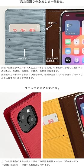 【素材】本体(外側)・カードポケット : 牛革(本革に波模様をエンボス加工) 本体(内側) : シャムード(人工スエード) 内側ケース : PC(ポリカーボネート)またはシリコン ステッチにはドイツの手芸糸老舗メーカー「ギッターマン(GUtermann)」の縫い糸を使用。