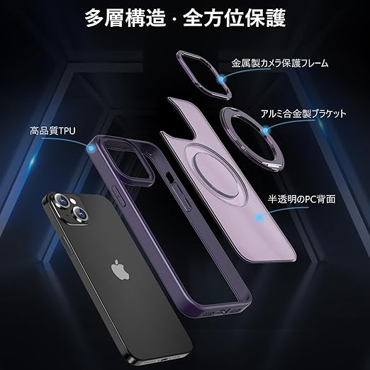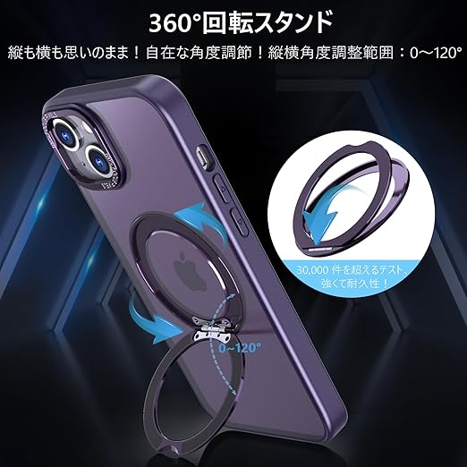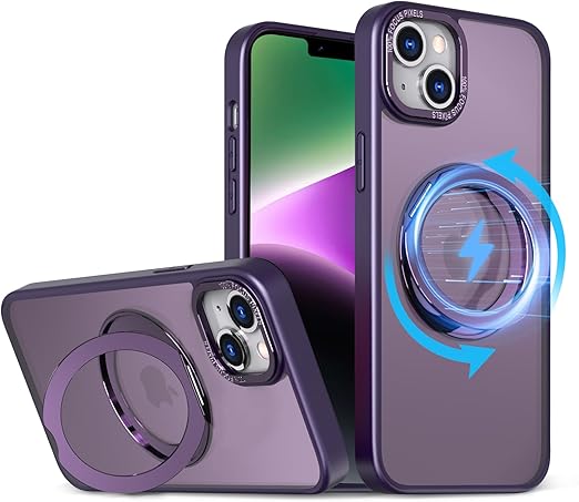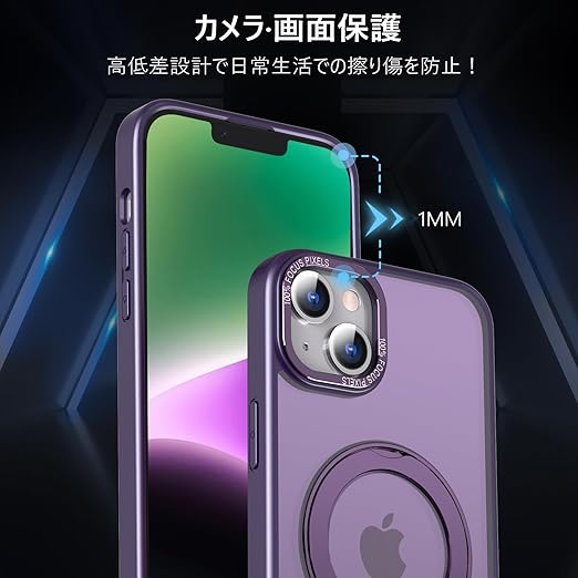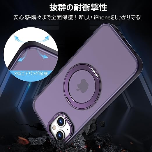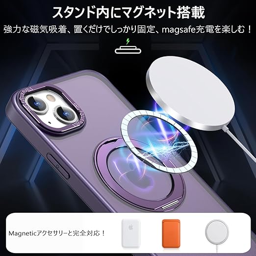 KWATUNG 互換品 ケース iphone14 用 ケース magsafe対応 ワイヤレス充電 いphone14 用ケース 耐衝撃 iphone13 用ケース magsafe対応 360°回転スタンド 縦横両対応 アイフォン14 用ケース マグネット搭載 アイフォン13用ケース 米軍MIL規格 スマホケース iphone 13 用 iphone 14 用 6.1インチ マット感 深い紫 a