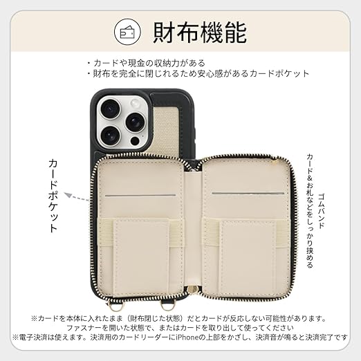 【コンパクト&大容量】ジッパー式+伸縮ゴムバンド。カードは伸縮ゴムでとめるため枚数にかかわらずしっかりと納まる。ファスナーポケットを加えて、お札、住宅カード鍵、お薬さえも、収納できる大容量スペースのカード入れiPhoneケース