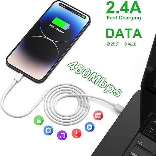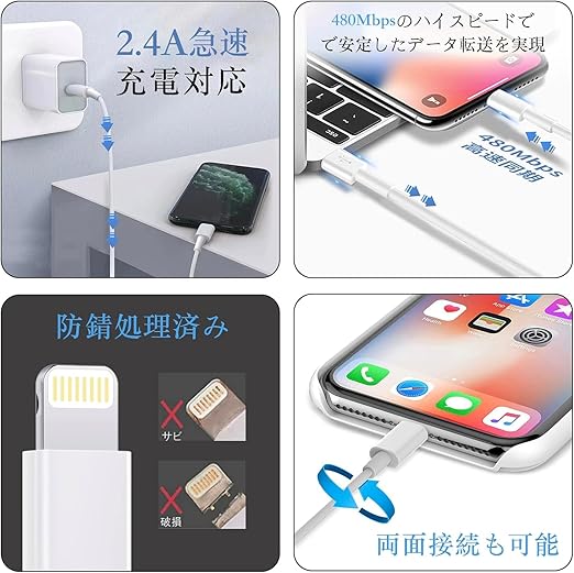 【2.4A急速充電・データ転送】アイホン充電コード内部に高品質の4芯銅線を採用し、普通のケーブルより約2倍(2.4A)のスピードで充電が可能で、充電時間