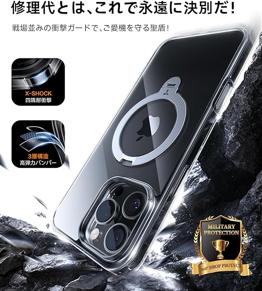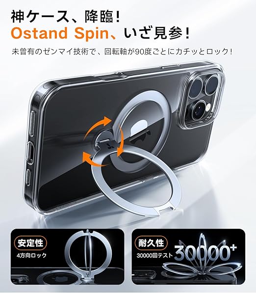 【カチッ!2024新開発・安定性】TORRAS iPhone 16 Pro Max 用 ケース ゼンマイ式スタンド 縦横両対応 リング マグネット搭載 MagSafe対応 ワイヤレス充電対応 米軍MIL規格耐衝撃 指紋防止 黄変防止 マグセーフ対応 6.9インチ いphone16pro max 用 ケース「Ostand Spin」クリア a