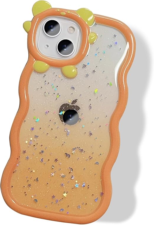 MuZiF iPhone 15 用 ケース クリア 透明 キラキラ かわいい 韓国 可愛い ネコ耳 ウェーブ TPUソフトケース 薄型 傷防止背面 滑り止め 指紋防止 耐衝撃 おしゃれ スマホケース アイフォン15 用 カバー (iPhone 15 用,オレンジ) a