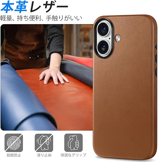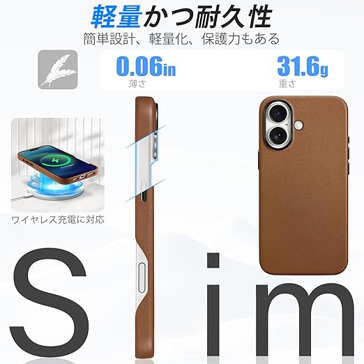 【iPhone16対応本革ケース・ワイヤレスと磁気充電可】本商品は本革レザー素材を採用したので、簡単に装着・脱着ができて、スマホ本体をしっかり保護します。軽量且つ極薄のデザインで、長時間スマホを使用しても熱がこもらないし、ワイヤレス充