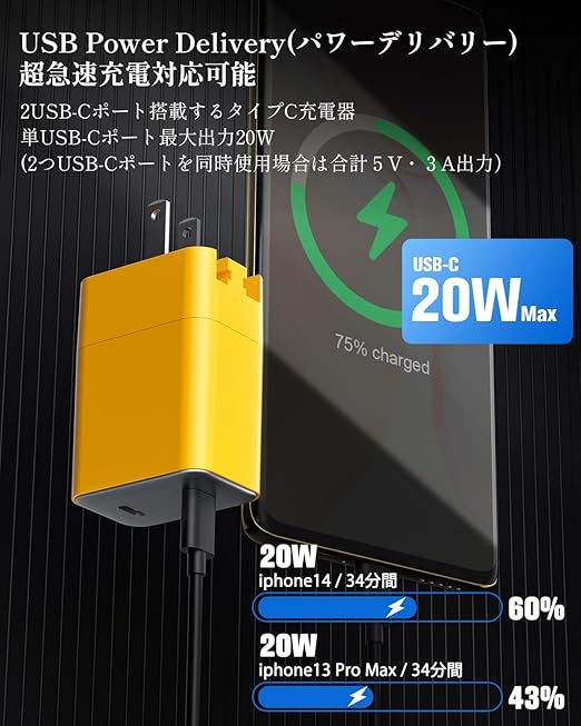【Type-C PD 20W高出力充電器・2台同時急速充電実現】今回のタイプC充電器は2つUSB-Cポートを搭載しており、2台デバイスを同時充電を実現します。単USB-Cポートは20Wの高出力を実現により、iPhone15/14/13/12などのスマホに急速充電対応できます。それに、iPad,iPodなどタブレットにも対応充電できます。複数のポートを併用した場合、分流が発生する場合がありますので、分流後の具体的な出力詳細については、商品の説明で記載の詳細ポート出力図、または取扱説明書の製品仕様表