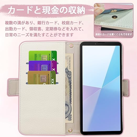 カード収納:表面のボタン付きポケットが便利です。表のポケットの金具は飾りではなくスナップボタンで実用性があるし、表面ポケットに交通系ICカードを入れられます、開け閉めもしやすいです。内側に実用性のカード入れポケット×3、内側ポケット×1、カード類、現金、名刺、免許証入れなどを収納でき、通勤も通学
