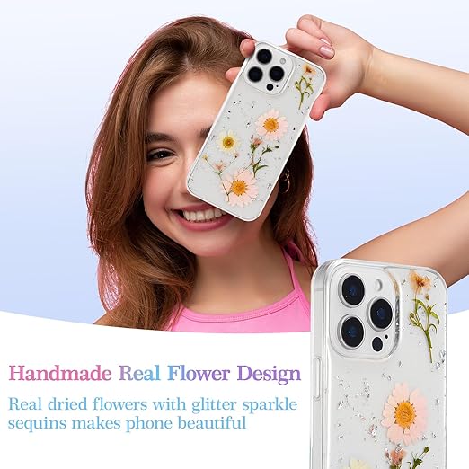 特別 ドライフラワー なデザイン:本物の花びらは、特別なエポキシ技術でケースに密封されています、非常に綺麗でオシャレです。いつでも自然の美しさを楽しむことができます!キラキラしている可愛い星型が施されているので、携帯をファッションアイテムに変身させます。