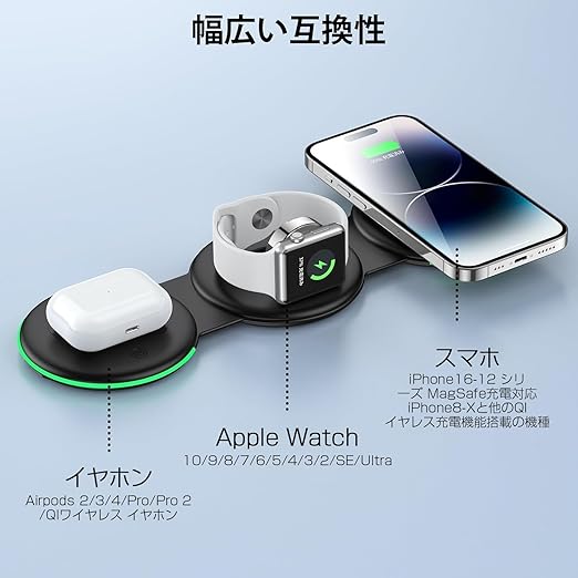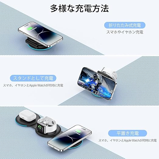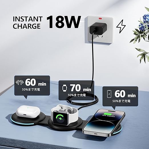 【3in1 MagSafe対応ワイヤレス充電器】 ADADPUのMagSafe対応ワイヤレス充電器F22は、マグネットでピタッとくっつくiPhone 16/15/14/13/12シリーズ全機種専用MagSafe対応ワイヤレス充電器だけではなく、iPhone 8/X/XR/XS/11/SE・Samsung・LG・Googleなどシリーズのスマホをワイヤレス充電できます。また、18WのQC3.0アダプターが付属して、スマホ、Apple Watch Ultra/10/9/8/7/6/5/4/3/2/S