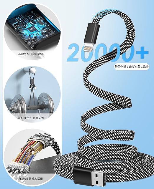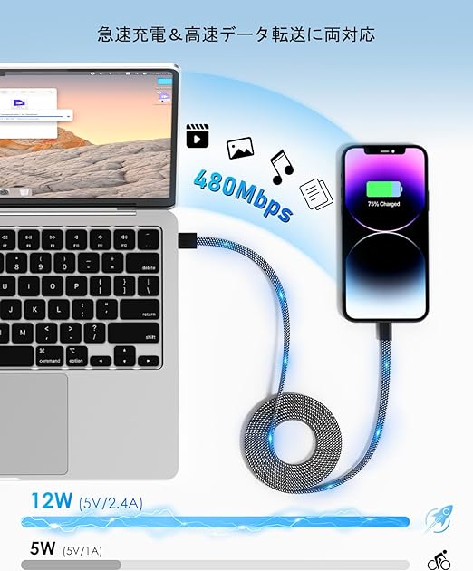 3A急速充電、480Mbps高速データ転送:本アイホン充電ケーブルは最大2.4A急速充電出力により、お使いのアップル製品を安全にかつフルスピードで充電します。また、本アイホン充電コードは最大480Mbpsのデータ転送速度をサポートし、1GBのファイ