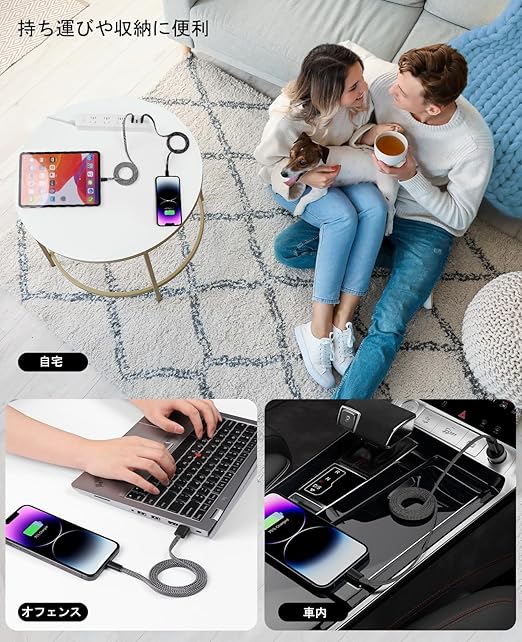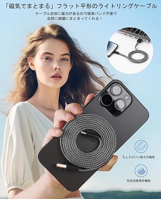 形状記憶機能、特許取得済:本iphoneケーブルには自体全体が均等な磁力によって決まった形状に巻き取られるよう設計されるため、使わない時は結束バンド要らず自然に渦巻状に戻ります。この独自技術は特許取得済で、国内外のサスティナビリティ先進企業も認めた。