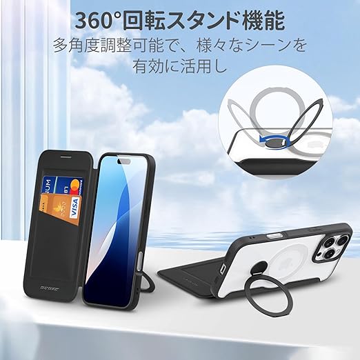 Fadkzyxr iPhone 16 Pro 用 ケース 手帳型 カード収納 MagSafe対応 リング付き 360°回転スタンド 縦横両対応 いphone16 Pro スマホケース レザー素材 軽い 薄型 耐衝撃 全面保護 アイフォン16 プロ 携帯カバー マグセーフ対応 おしゃれ ブラック a