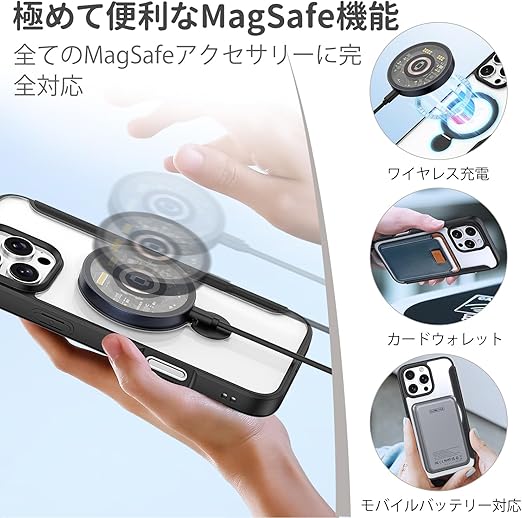 【MagSafe対応・ワイヤレス充電】:本ケースは、MagSafe対応のワイヤレス充電器、モバイルバッテリー、車載ホルダー、スタンド、リングなど、すべてのアクセサリーに完全対応しております。磁力による確実な接続と、充電時の信号干渉が発生しない設計により、効率的かつ安定した充電が可能です。自宅、車内、外出先を問わず、途切れることなく快適にご使用いただけ