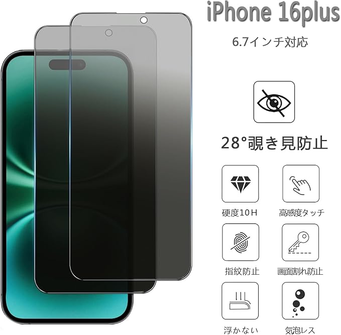 ★【対応機種】iPhone 16 plus(アイフォン 16 プラス)用。同梱物:28°覗き見防止強化ガラスフィルム2枚、レンズ保護フィルム 2枚 、ガイド枠1個 、取扱説明書。【品質保証】製品に初期の欠陥が見つかった場合は、注文履歴画面より出品者にご連絡いただき、お客様からのお問い合わせ内容に応じて代替品交換(一回無料で交換)・返金可能です。