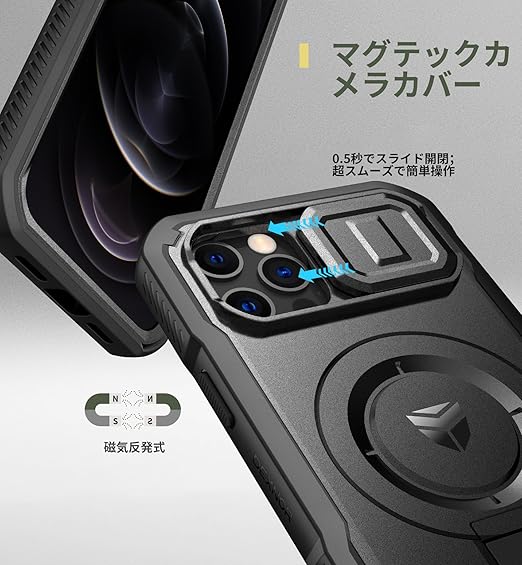 Dexnor iPhone 12&12 Pro用 マグネットケース - スライド式カメラカバー&調整可能キックスタンド&内蔵画面保護フィルム付き 耐衝撃 ヘビーデューティ ケース(ブラック) a