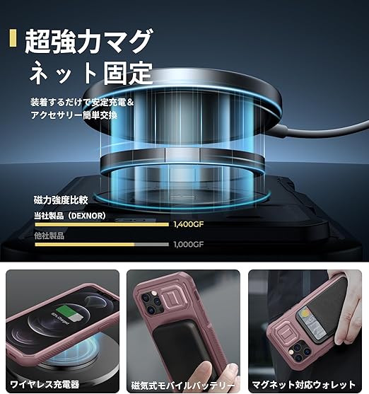 【強力マグネット機能】最大1,400gの磁力を実現する「マイティーマグネット」搭載。ワイヤレス充電器やカーマウントなど、あらゆる磁気アクセサリーに確実に吸着。どんな状況でもスマートフォンを安全に固定します。