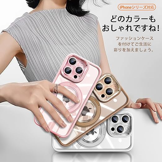 「製品仕様と特徴」対応機種:iPhone 15 Pro(アイフォン15プロ 6.1インチ)、製品サイズ:約15.2cm × 7.4cm× 1.1cm、重量:約0.08kg。特徴:360°回転スタンド、MagSafe対応超強い磁気、横置きにしても縦置きにしても自由に調整可能、リングスタンドにしてもiPhoneをしっかりホールドします。カメラカバーは自由に取付、取り外す設計、取付けるとレンズまで保護し、キラキラでオシャレなケースになる、カバーを取り外すとかっこいい大穴ケースになります。