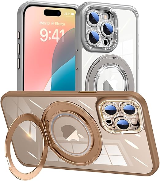 Damesine iPhone 15 Pro用ケース MagSafe対応 360°回転マグネットスタンド付き シリコン耐衝撃 透明背面クリア 軽量 薄い キラキラなカメラカバー自由に取り外し可能 2 in 1 ガラスフィルムレンズ保護 可愛いスマホケース 黄変防止 防塵ネット付き ワイヤレス対応 オシャレなアイフォン15プロケース グレー a