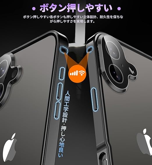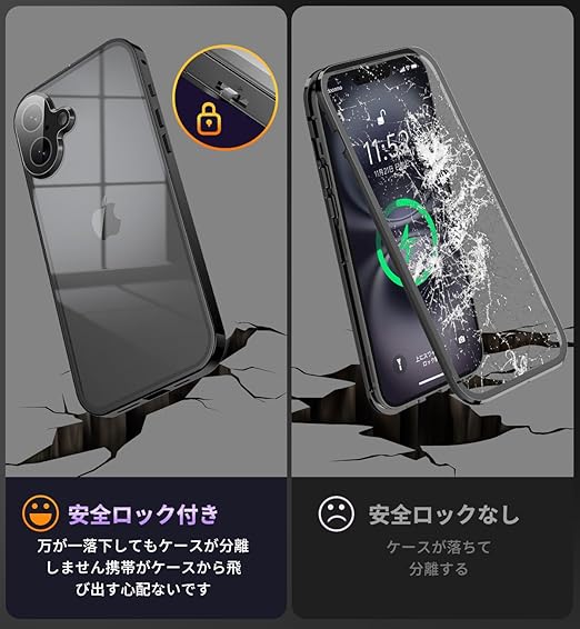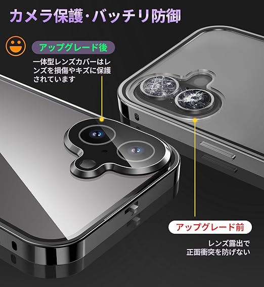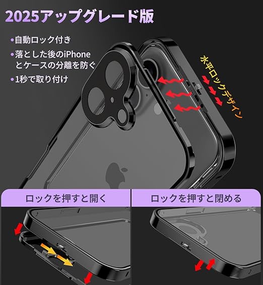 【ロック機能付き・1秒で取り付け・一体型レンズ保護付き】革新的な技術、このiPhone16 両面ケースは上部にスライドボタン式のロックがあり、前後のケースをしっかり固定します。上部のボタンを押すだけで、ロックの解除も簡単、取り付けで開く非常に便利です。こちらのあいふぉん16ケースであなたの大切なスマホを守ってあげてください!このiPhone16 ケースのバンパーとレンズ保護フィルムが一体型になっており、背面カメラ周りを覆い、カメラへの傷を防ぐ、カメラレンズ保護設計です。レンズの保護フィルムの必要
